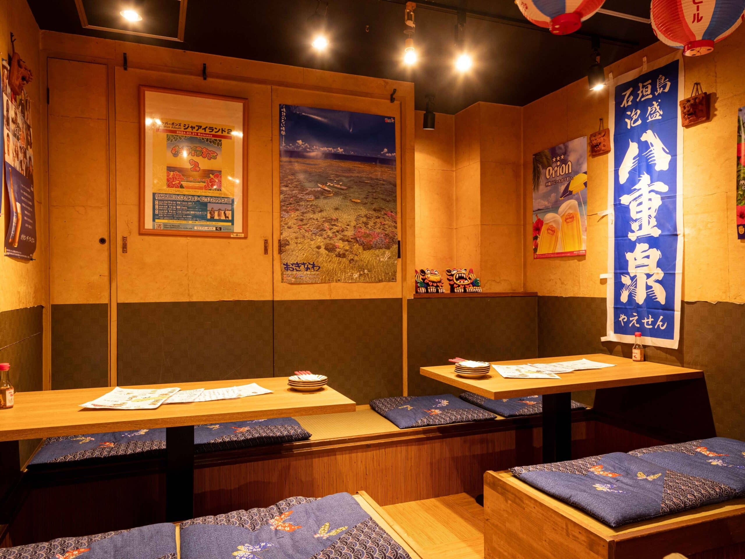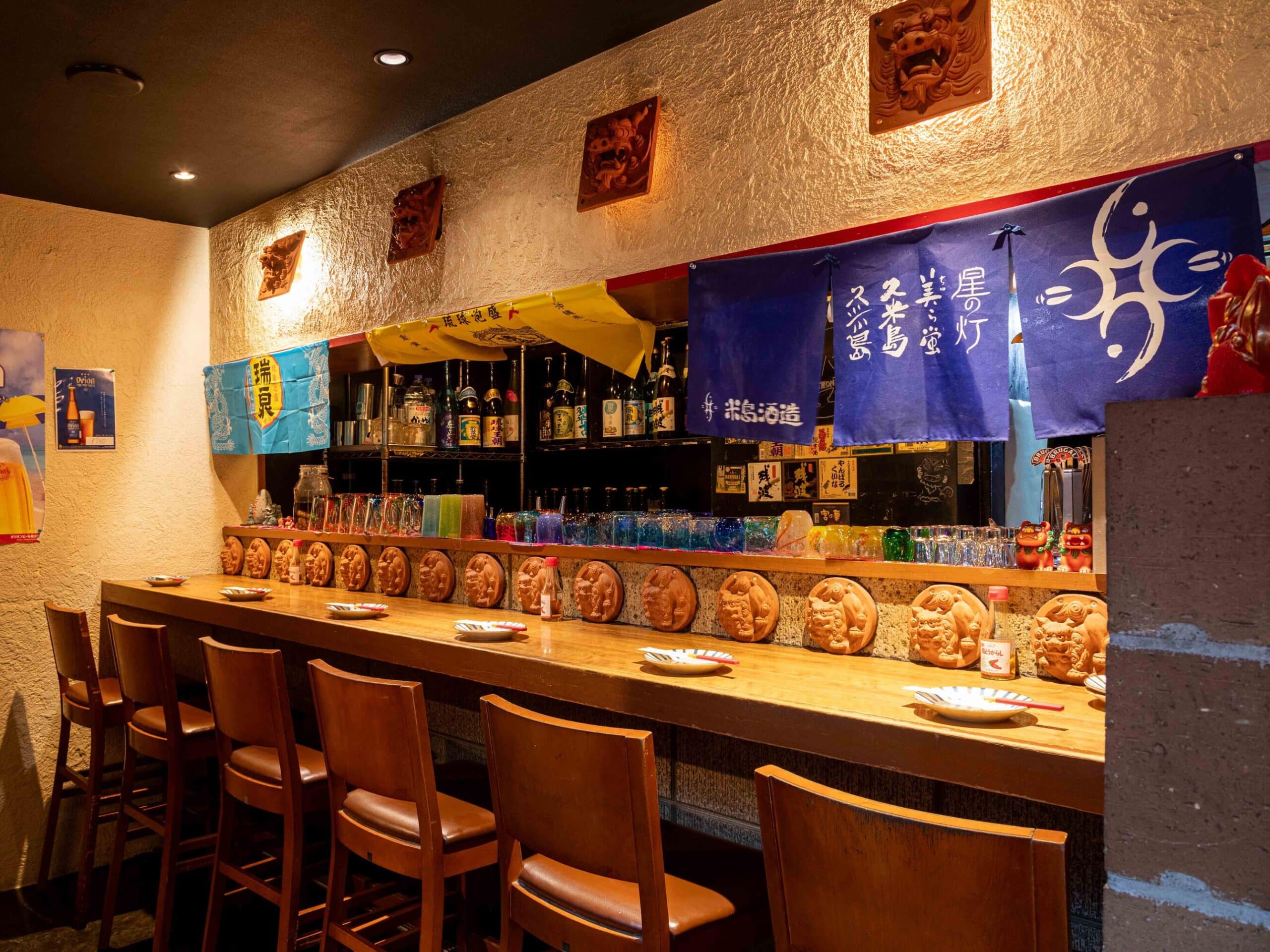沖縄に行ったような気持ちになれる、大らかで温かみのある空間♪店内はにシーサーや泡盛の瓶・オリオンビールの提灯など沖縄感あふれるグッズが並べられており、華やかで陽気な雰囲気をお楽しみいただけます!おしゃれなグラスが並ぶカウンター席、ご宴会向けの掘りごたつ席、開放的なテラス席もご用意しております◎